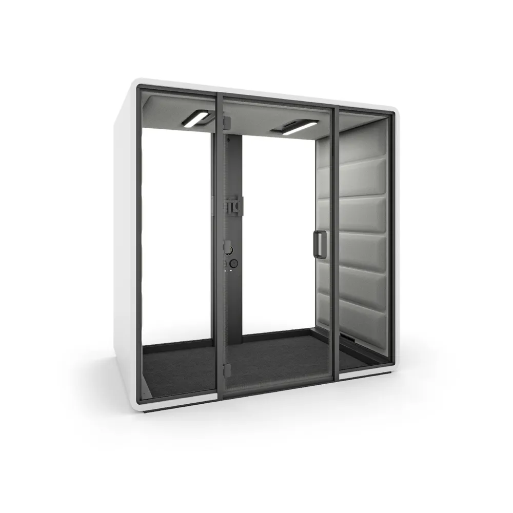 De HushFree.Access.L is uitgerust met een nieuw LED-verlichtingssysteem met een lichtintensiteit van 500 lux op tafelbladhoogte. De cabine stelt je in staat om meer tijd te besteden aan vergaderingen en gesprekken, of deze nu fysiek of online plaatsvinden, terwijl je rust behoudt. De pod is ontworpen voor face-to-face of hybride gesprekken die privacy vereisen, voor teamvergaderingen of creatief werk. Het is ook ideaal als kleine, privéwerkruimte of kantoor. Je kunt de cabine naar eigen wens inrichten en het interieur zelf samenstellen.