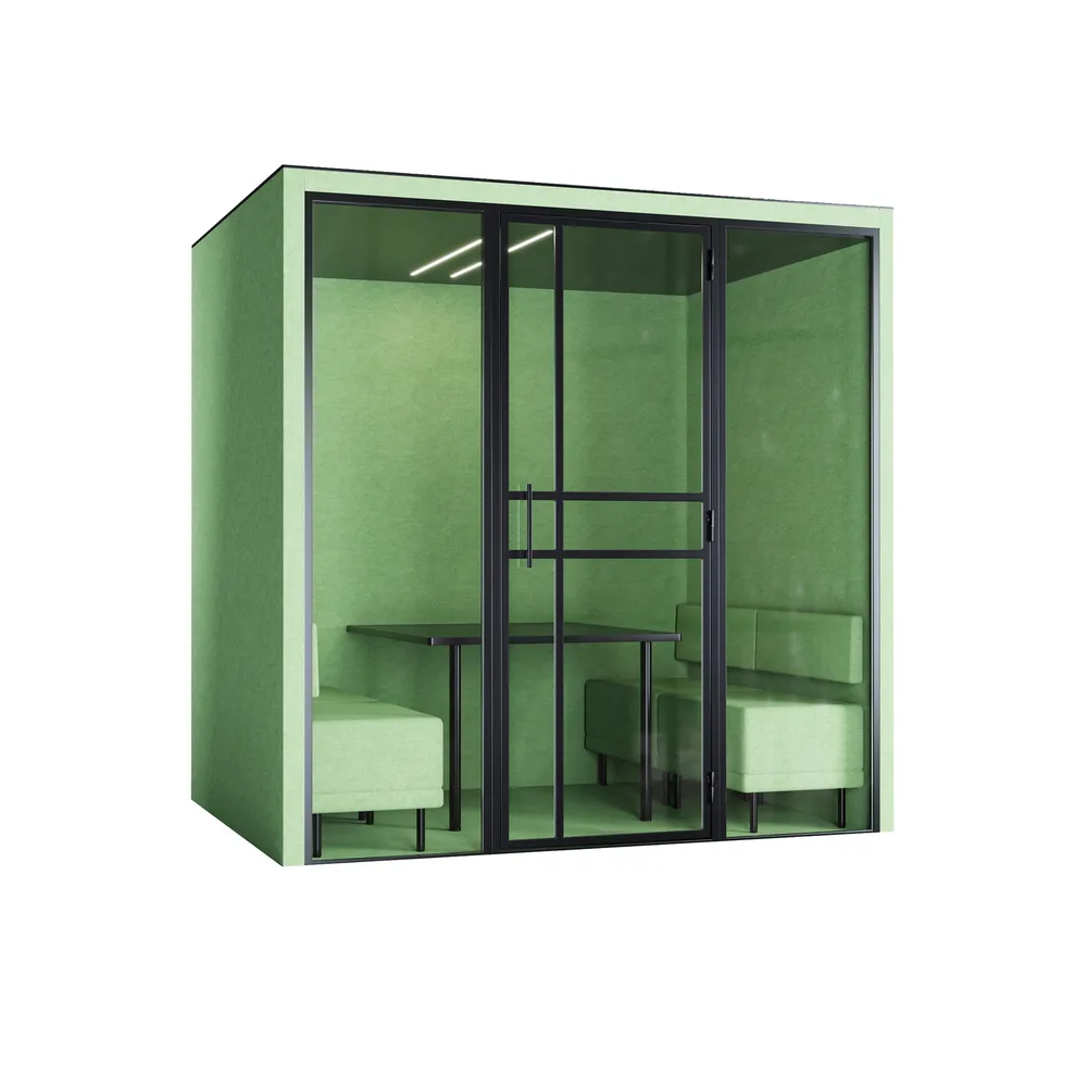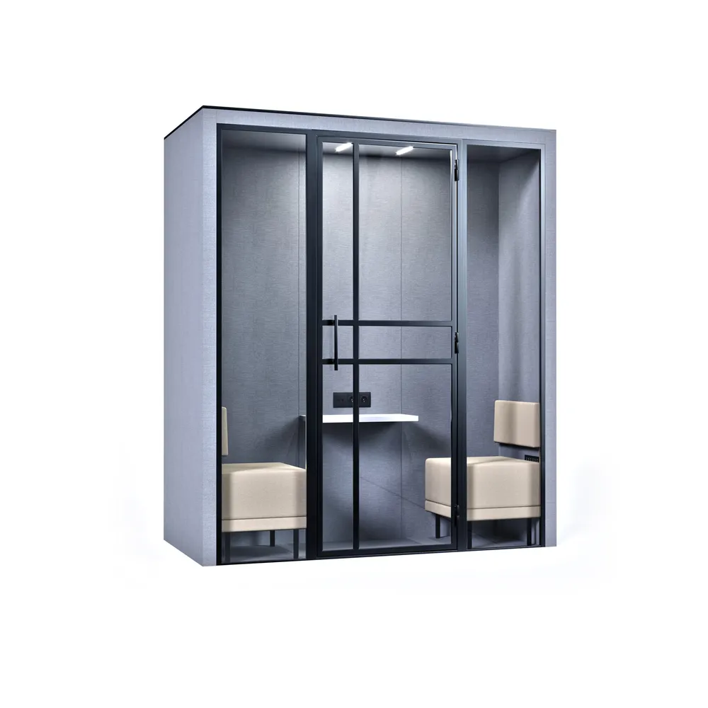 Een comfortabele, modulaire vergaderruimte voor 3 personen, de TOC Meet 3. Hij neemt niet veel ruimte in beslag en past in elk kantoorinterieur. Het biedt ideale omstandigheden voor het houden van vergaderingen of videoconferenties en voor het uitvoeren van taken die concentratie vereisen.